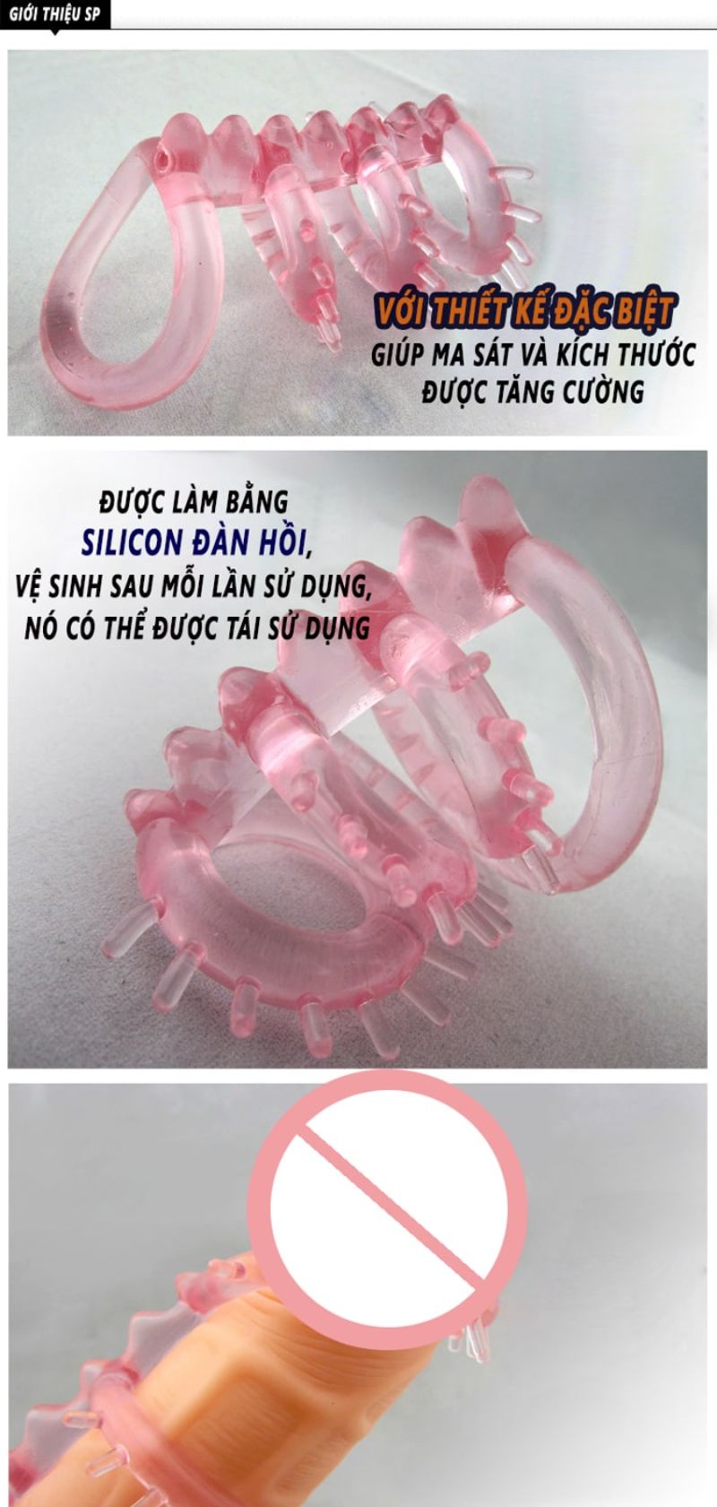 Sản phẩm này có 3 vòng silicon được nối tiếp nhau cùng một kích thước những điểm xuyết trên các vòng silicon có 14 tua gai mềm mại. Nhờ vào đặc điểm nổi bật này sẽ giúp kích thích chị em bởi các tua gai kích thích và massage âm đạo làm chị em sung sướng hơn. Ngoài ra chúng còn kích thích mạnh mẽ lên phần thành âm đạo khi các anh ra vào liên tục.